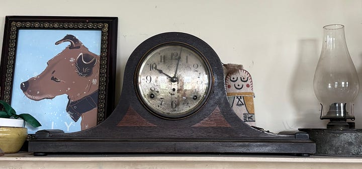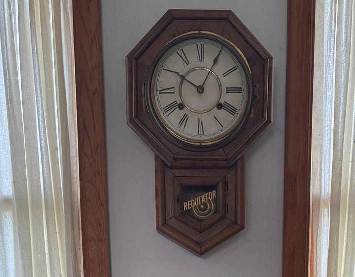We have the Seth Thomas wind up mantle clock that my grandparents had and the antique school house clock I bought my mother back in the 1980s. That gentle rhytmic tick ticking punctuated by the hourly chimes, are peaceful sounds that can calm me down even in anxious times.
