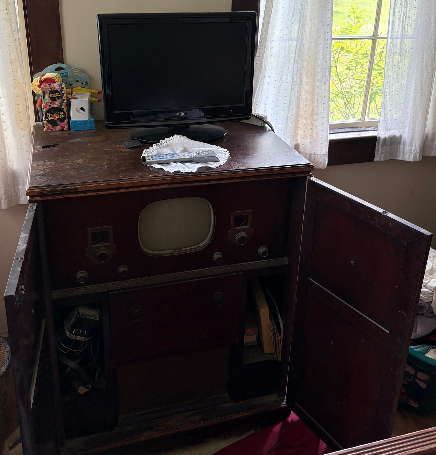 I still have my grandparent’s 1949 Crosley entertainment center from the 1950s with its eight inch TV screen. We use it as the stand for our TV in the bedroom. The last time I plugged it in, the screen did light up, but no reception. I do have a dim memory of watching this TV in the late 1950s rolling and rolling while someone had to continually adjust the vertical hold.