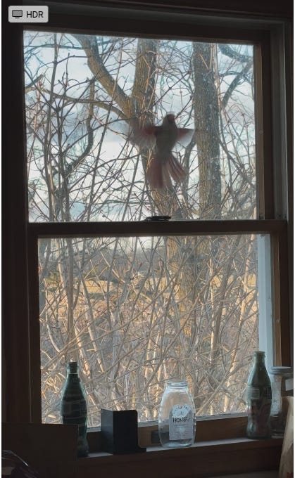 Those big panes of glass, though, do confuse birds. We get several that dive into their reflections in the glass. And last spring there was a female cardinal that for weeks would flutter around a window in the kitchen.